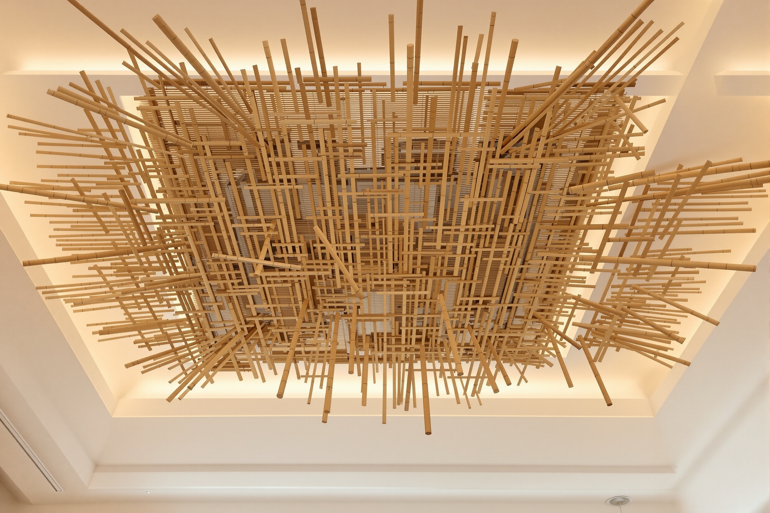 Çağdaş iç mekan tasarımları için profesyonel montaj ile birlikte sunulan modern bambu duvar kaplaması.